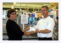 Below  – Dave Perfitt, former manager of Nakusp Overwaitea presenting a cheque to the foundation’s Barb Chwachka. Money is from donated Overwaitea Points.